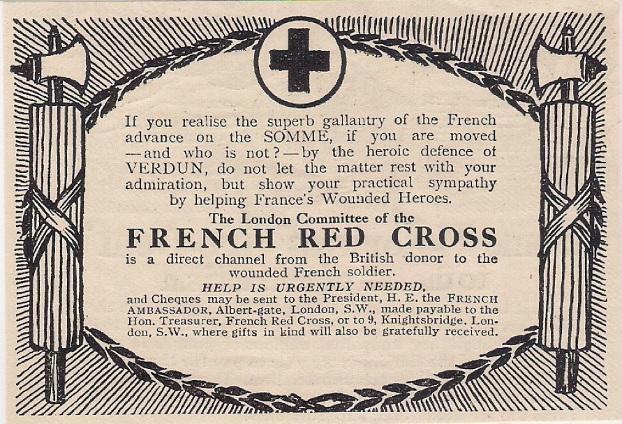 De 1914 à 1918, soutenu entre autres par l’Ambassadeur de France à Londres, le Comité Franco-Britannique de la Croix Rouge présidé par Mme de la Panouse a multiplié ses activités en faveur des soldats alliés blessés utilisant pour cela les fonds versés par de nombreux donateurs anglais et écossais.
