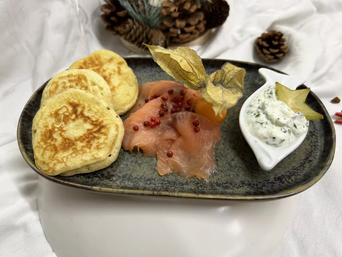 Sur la photo, une entrée, "saumon fumé, sauce aneth, minis blinis"